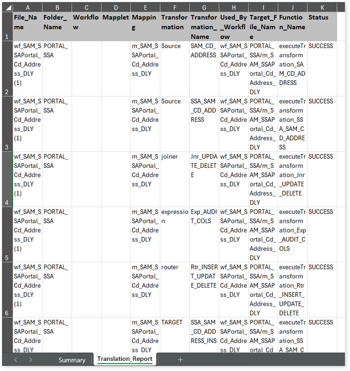 • Translation_Report: Provides a comprehensive report of the conversion including information about workflows, mapplets, mappings, transformations, and more.