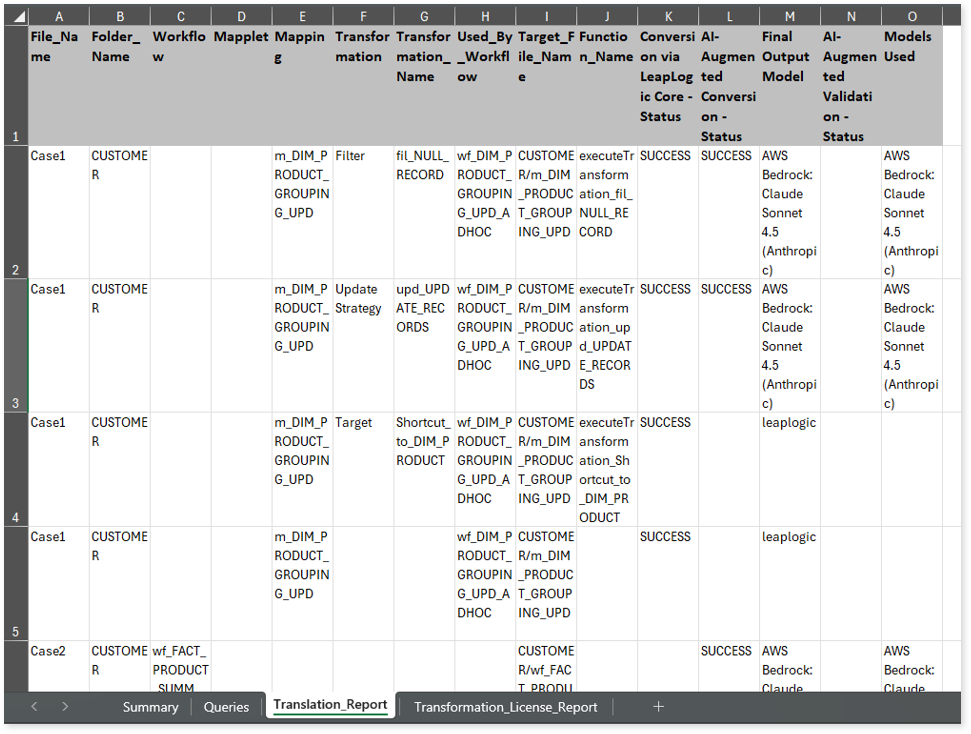 The Translation_Report sheet in Transformation_Report.xlsx file provides a comprehensive report of the conversion. It includes information about workflows, mapplets, mappings, transformations, and more.