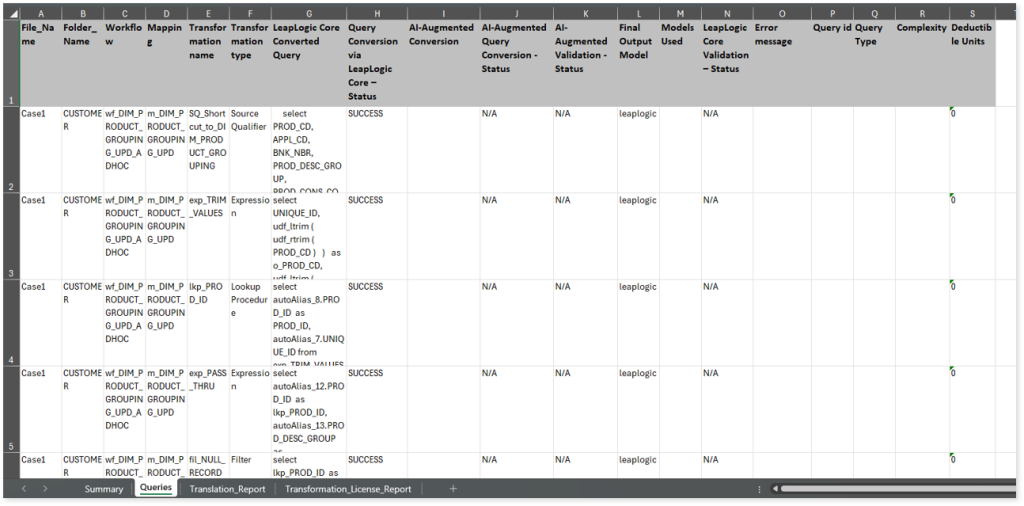 - AI-Augmented Conversion: Displays the queries that are transformed by the LeapLogic AI models.