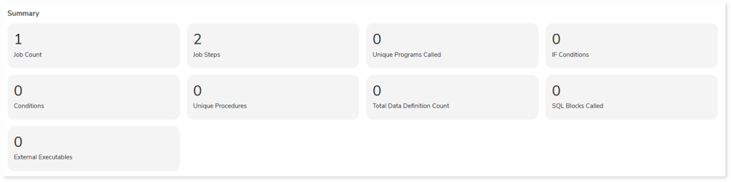 This section presents an overview of the input files and the associated workload inventory. It includes details such as the total number of jobs, job steps, If conditions, conditions, and other key elements identified during analysis.