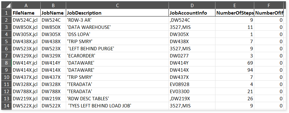 Job Summary.csv: Provides information about JCL jobs, including descriptions, account details, number of steps, and more.