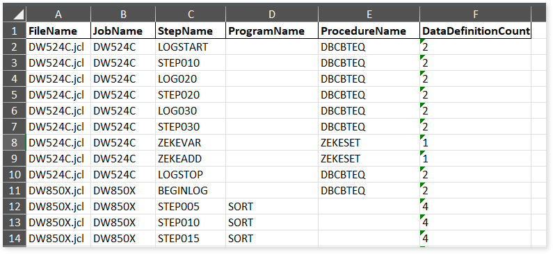 Job Step Summary.csv: Provides information about JCL job steps, including associated jobs, programs, procedures, and the number of data definitions used in each step.