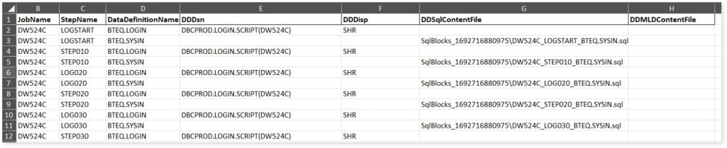 Job DD Summary.csv: Provides information about JCL job Data Definitions, including associated jobs, steps, DISP attributes, and more.