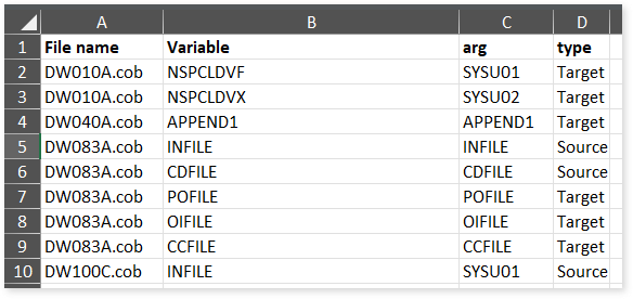 Cobol File Variable Arg Map.csv: Provides information about COBOL file variables, including their corresponding arguments and type.