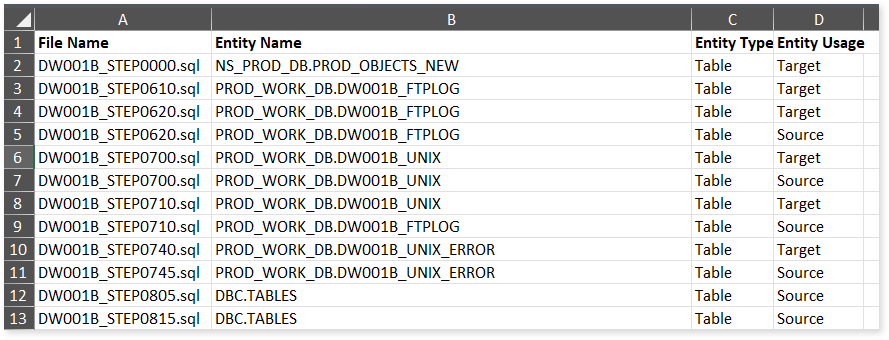 BTEQ_Analysis.csv: Provides information about the BTEQ script, including associated entities, entity types, and usage operations such as INSERT, DELETE, or CALL.