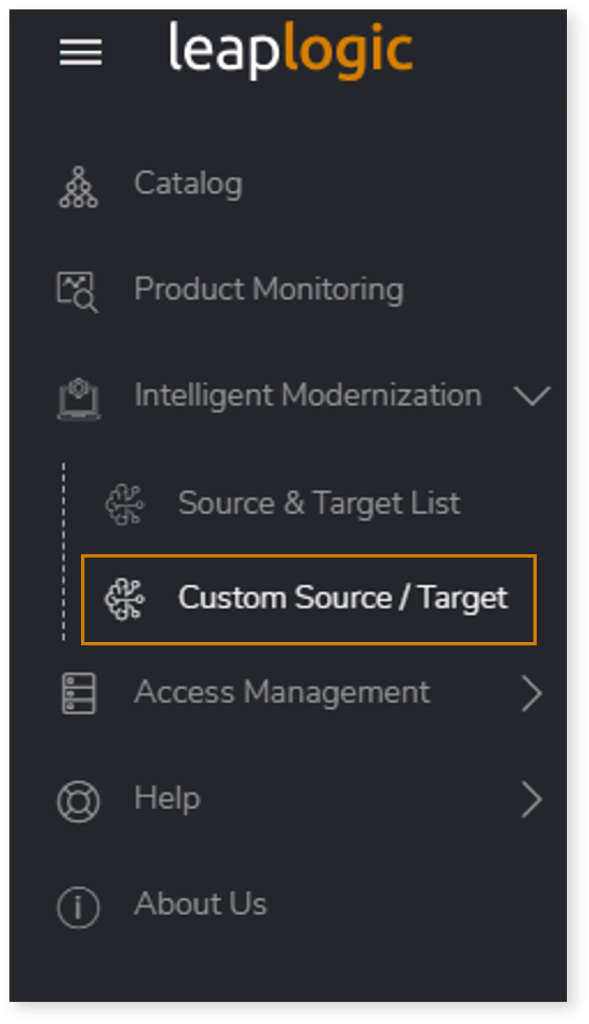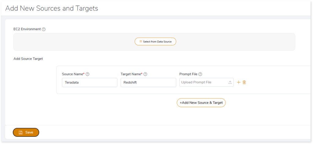 To enable workload conversion using LeapFusion, as a prerequisite, you need to configure the source and target on the Add New Sources and Targets page. For Open-source AI models in LeapLogic—which include Embark, Energize, Intercept, and Velocity—you also need to provide the EC2 instance connection details and a prompt file (.txt), in addition to the source and target configuration.