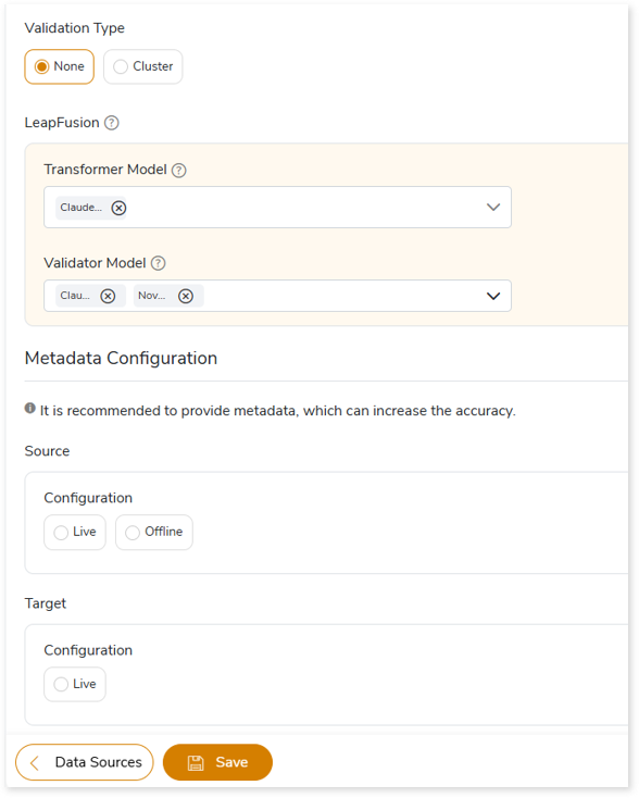 - In LeapFusion, select the preferred Transformer and Validator models to convert queries that require augmented transformation, and perform syntax validation for accuracy and optimal performance.