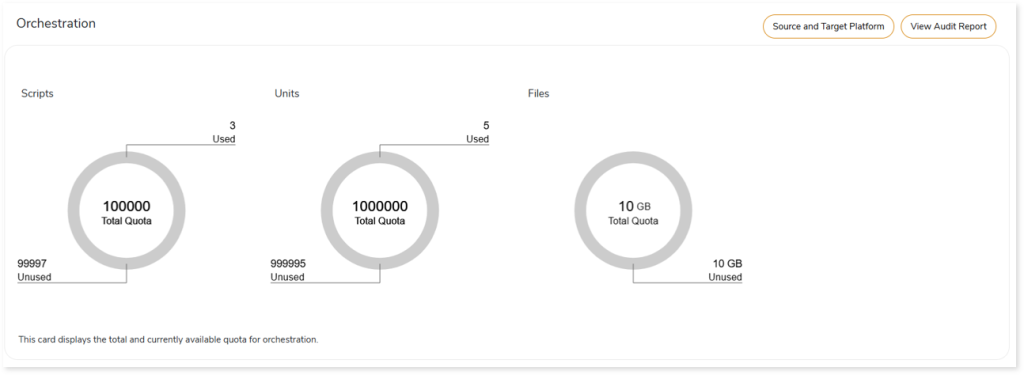 This card displays the total and currently available script, unit and file quota for orchestration conversion.
