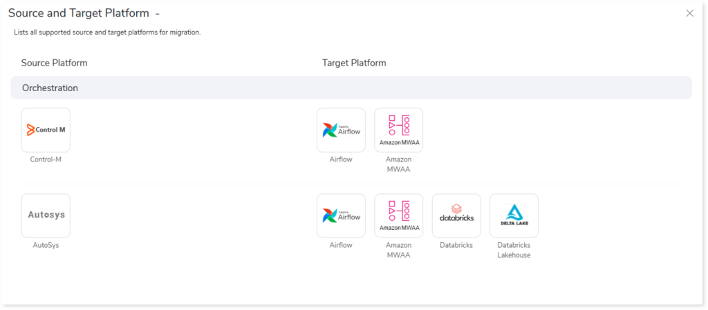 to view a list of all supported source and target platforms for orchestration.