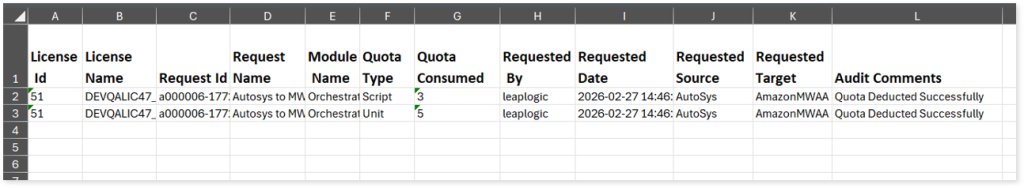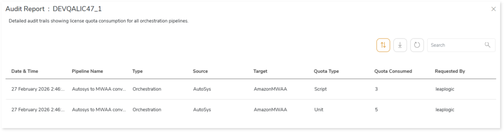 to see detailed audit trails showing license quota consumption for all orchestration conversion pipelines. It also includes information about date and time of execution, source, target, quota type and more for each pipeline.