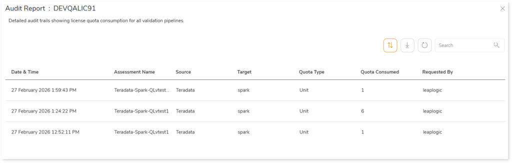 to see detailed audit trails showing license quota consumption for all validation pipelines. It also includes information about date and time of execution, source, target, quota type and more for each validation pipeline. Additionally, you can download the license deduction history from
