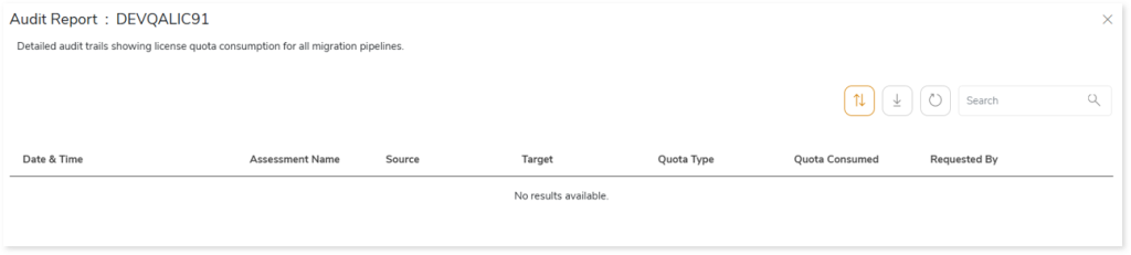 to see detailed audit trails showing license quota consumption for all assessments. It also includes information about date and time of execution, source, target, quota type and more for each assessment. Additionally, you can download the license deduction history from