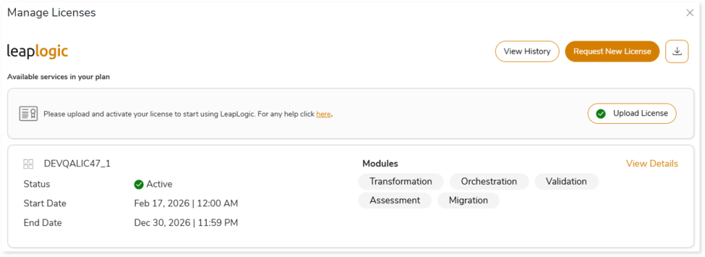 License Details provide comprehensive information regarding your licensing status, activated licenses, upcoming licenses, and a history of expired licenses. You can also monitor the granted licenses and LeapLogic service usages.