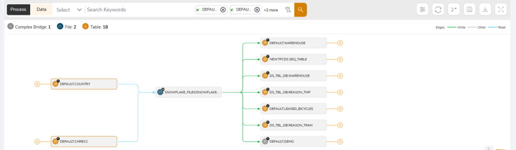 - Process lineage illustrates the dependencies between two or more processes such as files, views, tables, etc.