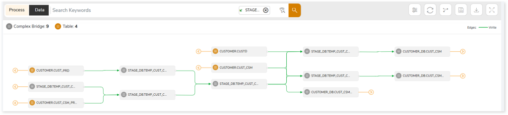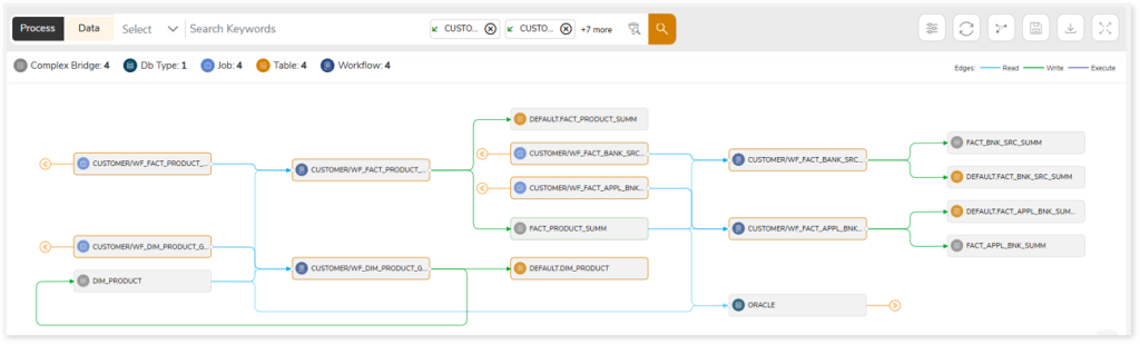 • Process lineage illustrates the dependencies between processes or scripts such as DML files, orchestration files, procedures, Informatica workflows, DataStage jobs, etc.