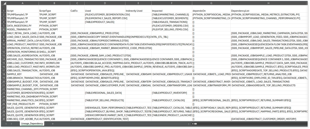 Lineage Dependency.csv: This report provides detailed lineage information for various scripts, including script type, direct dependencies, used, indirectly used, and impacted tables, jobs, files, and other components.