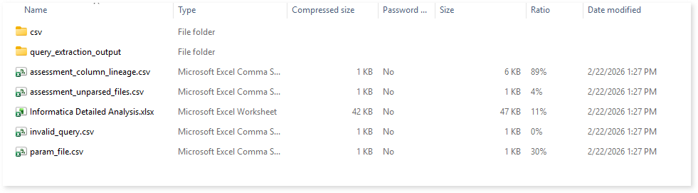 To access other assessment reports, open the informatica folder. Here, you can see CSV, pattern, and query folders along with assessment_column_lineage.csv, informatica_data lineage, and param_file.csv reports.