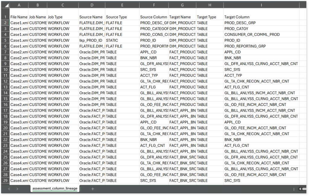 assessment_column_lineage.csv: This report provides information about column‑level lineage, including how each source column connects to its target column, the associated job type, and other related details.