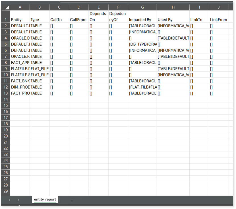 entity_report.csv: This report gives detailed lineage information for each entity in the uploaded source files. It lists all entities along with their types, dependencies, and relationships. The report also shows what each entity depends on, what impacts it, where it is used, and so on.
