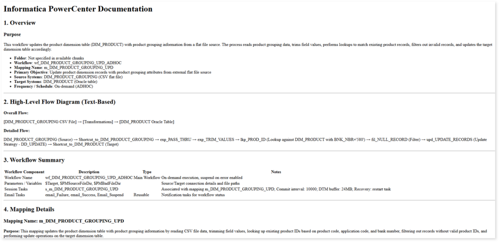 • Workflow Summary: Lists all the workflows existing in the Informatica files. It also provides statistical information about the worklets, sessions, mappings, mapplets, expressions, transformation components such as sequences, filters, joiners, and so on.