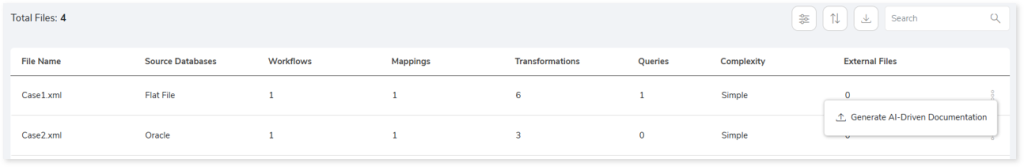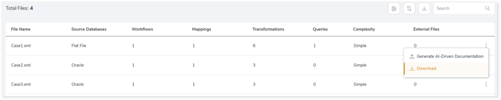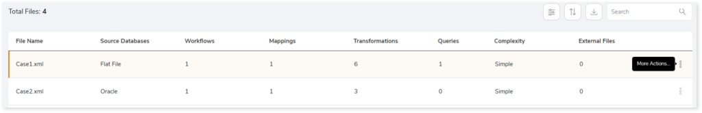 • Volumetric Info: Lists an aggregated inventory of every source Informatica file. For instance, it provides information about the total number of files, transformations, workflows, mappings, and a lot more.