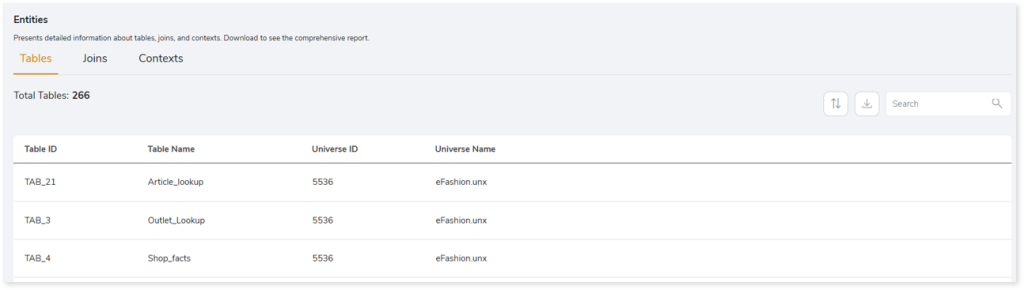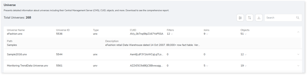 This section provides detailed insights into Universes, including associated reports, objects, parameters, entities, and more.