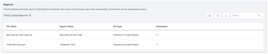 - Crystal Report Table Summary: Provides information about tables in the reports. It includes information about the databases, fields, parent reports, and more.