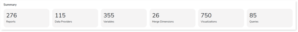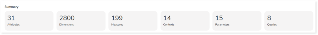 - Volumetric Info: Provides volumetric information about the artifact types such as tables, logical tables, and reports.