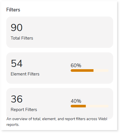 - Element Filters: Displays the total number of element filters in the WebI reports. Element filters restrict data for a specific table or visualization without affecting other report elements or the underlying query.