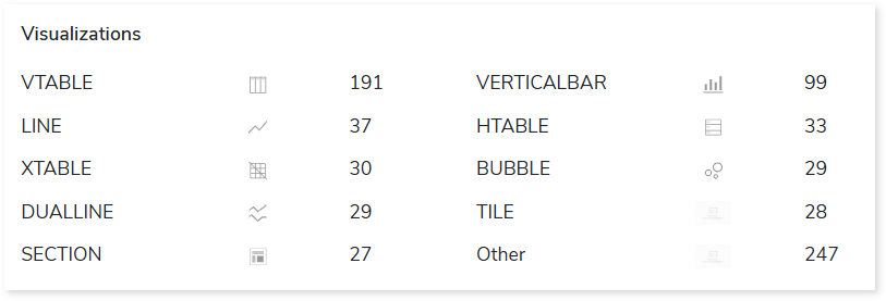 This section provides details about the different visualization types (such as tables, line graphs, charts, etc) used in WebI reports, along with their counts. These visual elements help present data in an easy-to-understand format.