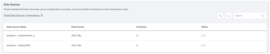 - Universes: Displays the number of universes in the source input files. A universe is a set of metadata objects for analyzing and reporting data.