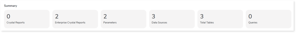 - Crystal Reports: Displays the number of Crystal reports in the source input files.