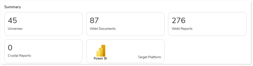 - WebI Documents: Displays the number of WebI documents in the source input files.