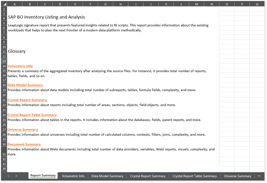 SAP BO Report.xlsx: This report provides insights about the source inventory. It helps you plan the next frontier of a modern data platform methodically. It includes information about crystal reports, data models, universes, and more.