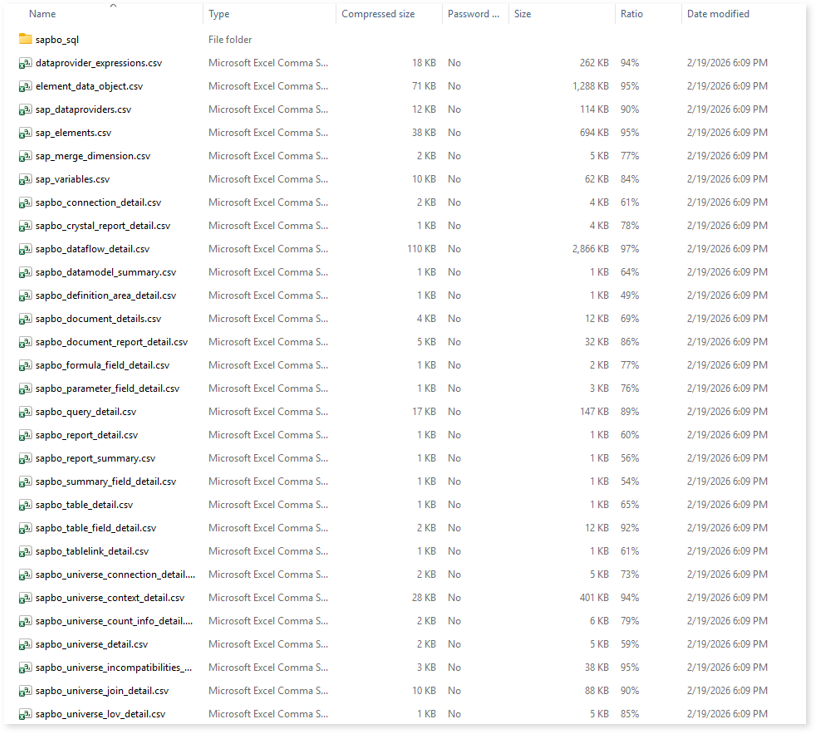 Browse through bi > sapbo > csv folders to access all the generated CSV reports such as sapbo_datamodel_summary.csv, sapbo_parameter_field_detail.csv, sapbo_report_detail, sapbo_table_detail, and more.