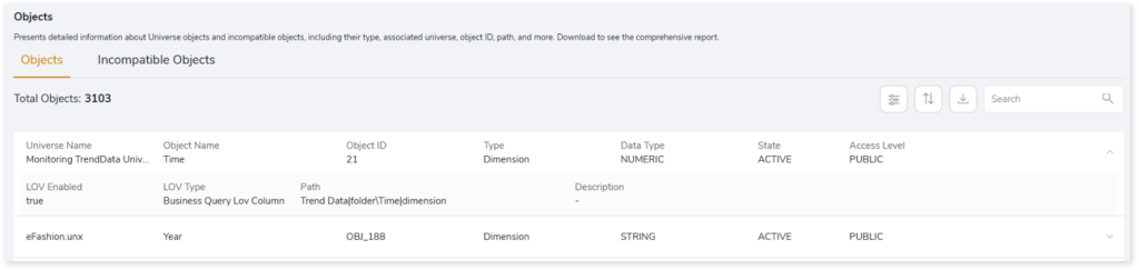 This section provides detailed information about Universe objects and incompatible objects, including their type, associated universe, object ID, path, and other related details.
