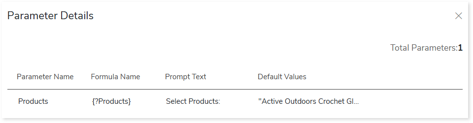 sapbo_parameter_field_detail.csv: This report provides information about parameters including its type, expression or formula that uses the parameter, prompt text, and more.