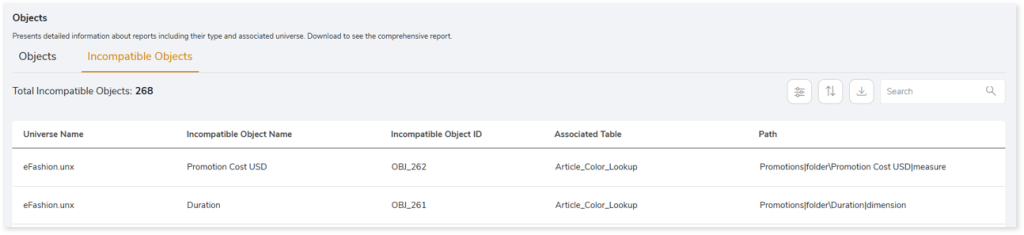 - Object ID: Displays the unique identifier (ID) of each incompatible object.