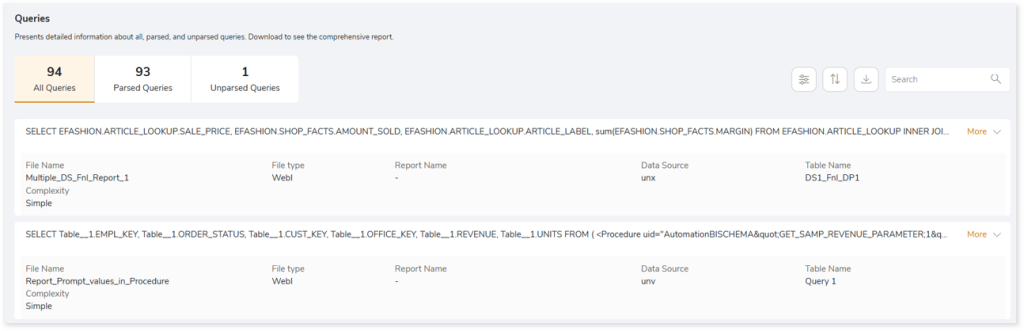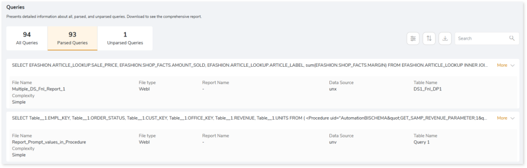 - Volumetric Info: Presents a summary of the aggregated inventory after analyzing the source files. For instance, it provides total number of reports, tables, fields, and so on.