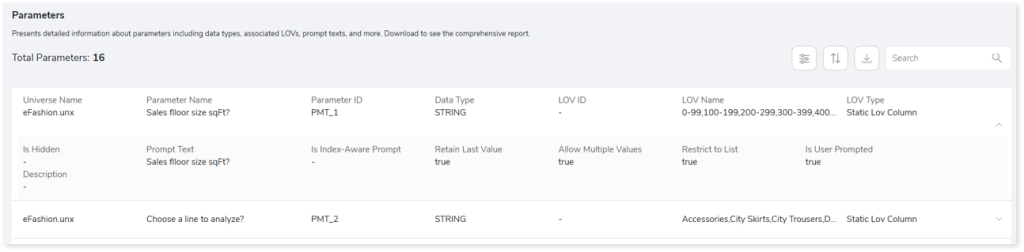 This section provides detailed information about all parameters in the universes, including their associated universe, parameter ID, data type, prompt text, and other related details.