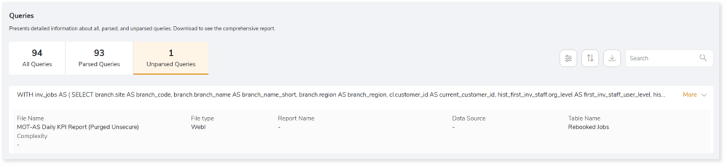 This section displays a list of all the unparsed queries.