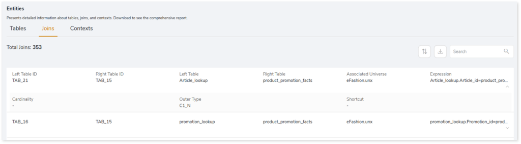 entity_links.csv: This report provides information about how views are connected to entities or tables and how these links extend across multiple levels. Level 1 shows the immediate table to which a view is linked. If that table is further connected to another entity, the next connection appears in Level 2, and so on.