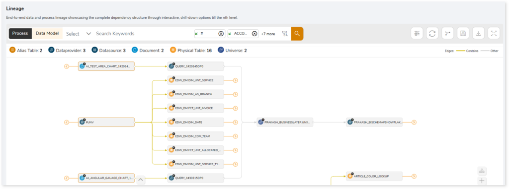 End-to-end process lineage identify the complete dependency structure through interactive and drill-down options to the last level.