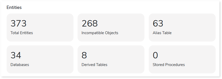 This section provides details about entities present in the Universes. It includes information about the total number of entities (tables, stored procedures, objects), incompatible objects, tables aliases, databases, derived tables, and more.