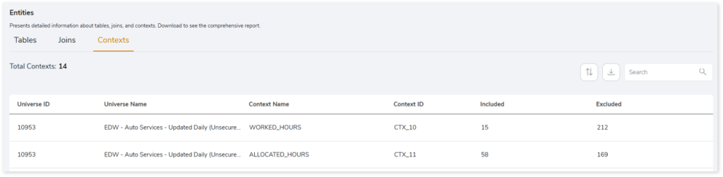 - Universe Summary: Provides information about universes including total number of calculated columns, contexts, filters, joins, complexity, and more.