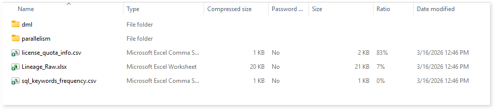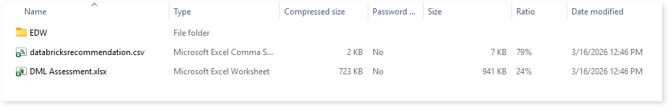 DML Assessment.xlsx: This report provides insights about the source inventory. It helps you plan the next frontier of a modern data platform methodically. It includes a report summary, schema recommendations, column level lineage, and more.