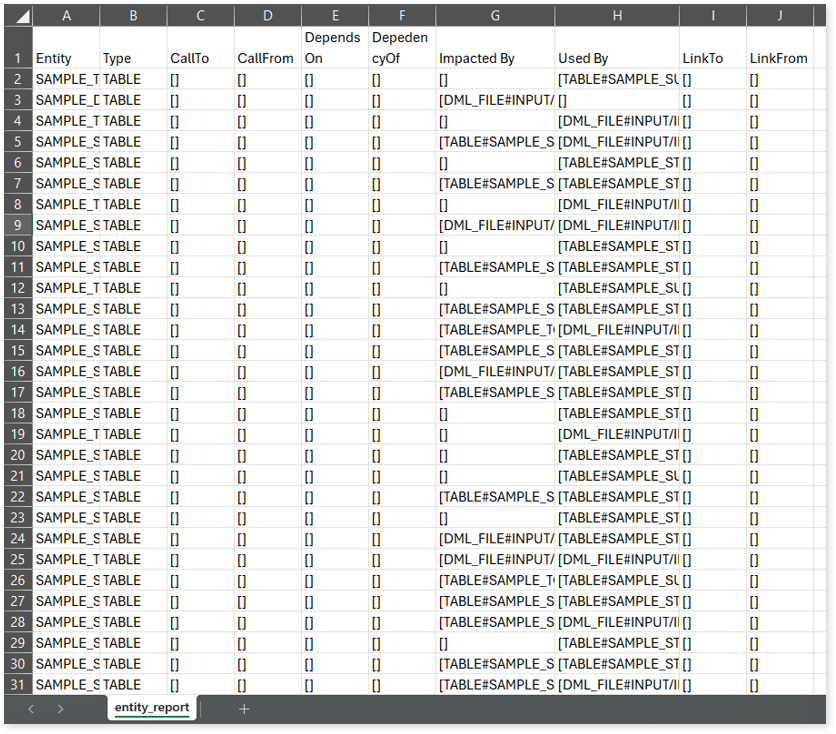entity_report.csv: This report gives detailed lineage information for each entity in the uploaded source files. It lists all entities along with their types, dependencies, and relationships. The report also shows what each entity depends on, what impacts it, where it is used, and so on.