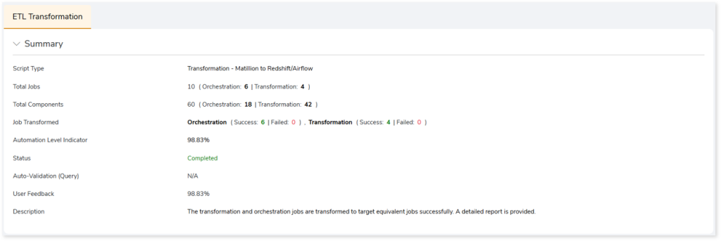 This topic shows a comprehensive report of the converted artifacts. The left panel lists all the input files along with the file-wise transformation percentage. The right panel shows information about the selected file. It includes information about the jobs, job type, components, and auto-conversion rate along with the status and success or failure messages. The failure message helps you understand the error and guides you to fix it.