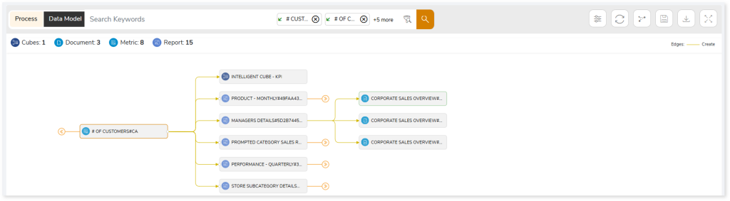 - Metrics: Lists all the metrics (objects that represent business measures to perform calculations, for example, sales, profit, revenue, etc.) along with the associated details such as metric conditions, metric types, metric formulae, and likewise.