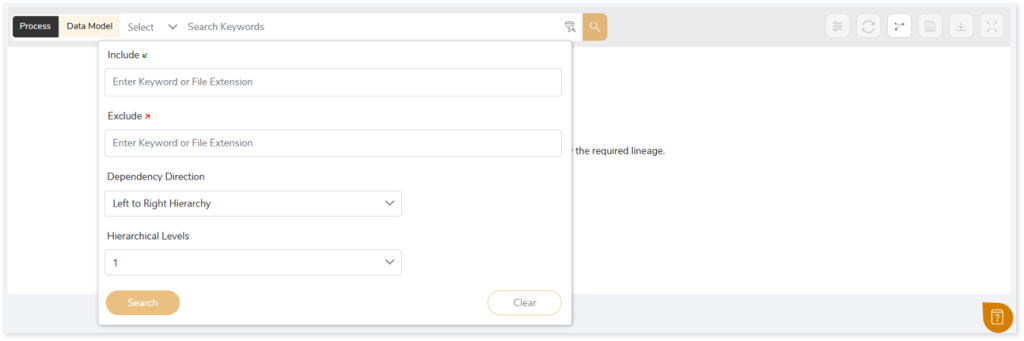 In addition, the filter search icon allows you to include or exclude particular nodes to obtain the required dependency structure. You can also choose the direction of the lineage. By default, the Dependency Direction is Left to Right Hierarchy. You can also choose Right to Left Hierarchy or Bidirectional dependency directions as required. Moreover, you can also increase the Hierarchy Levels to nth level.